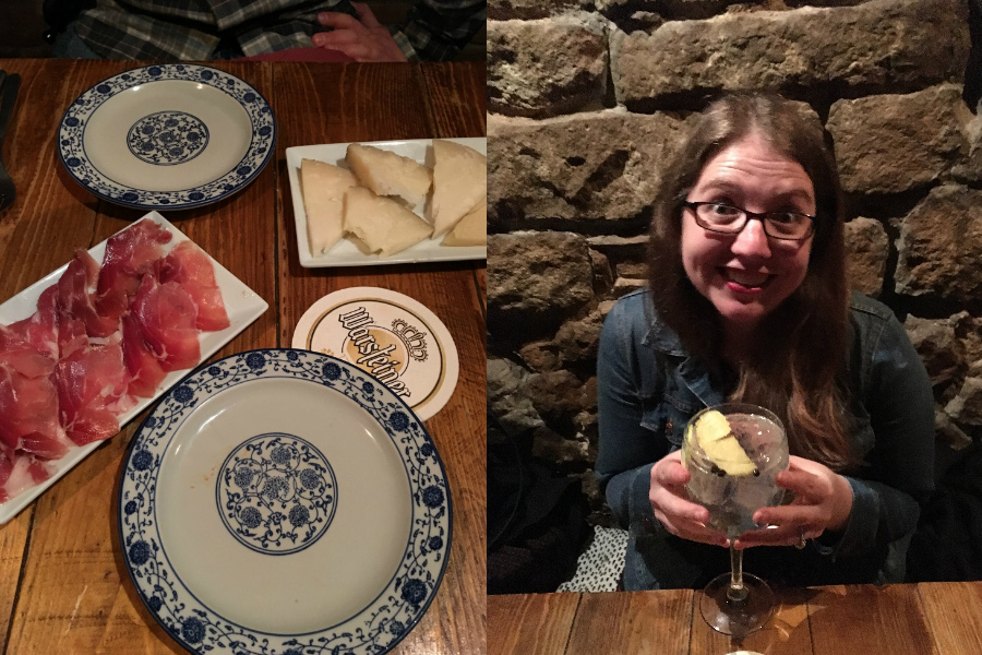 After a little rest to recover from our jet lag, we headed to the Gothic Quarter for dinner. It is true that most restaurants do not open until 7 or 8 o’clock at night. Andrew and I really didn’t have a problem adapting to this though. We just kind of moved all our meals back, and we also didn’t mind being the first people in a restaurant when it opened at 8pm. We had a very traditional tapas meal our first night at La Alcoba Azul, and it was one of my favorite restaurants that we stopped at in Barcelona. Highly recommended! We split jamón Ibérico (a must-have in Spain), manchego cheese and a few other tapas. I was also introduced to my new obsession: Spanish gin tonics.