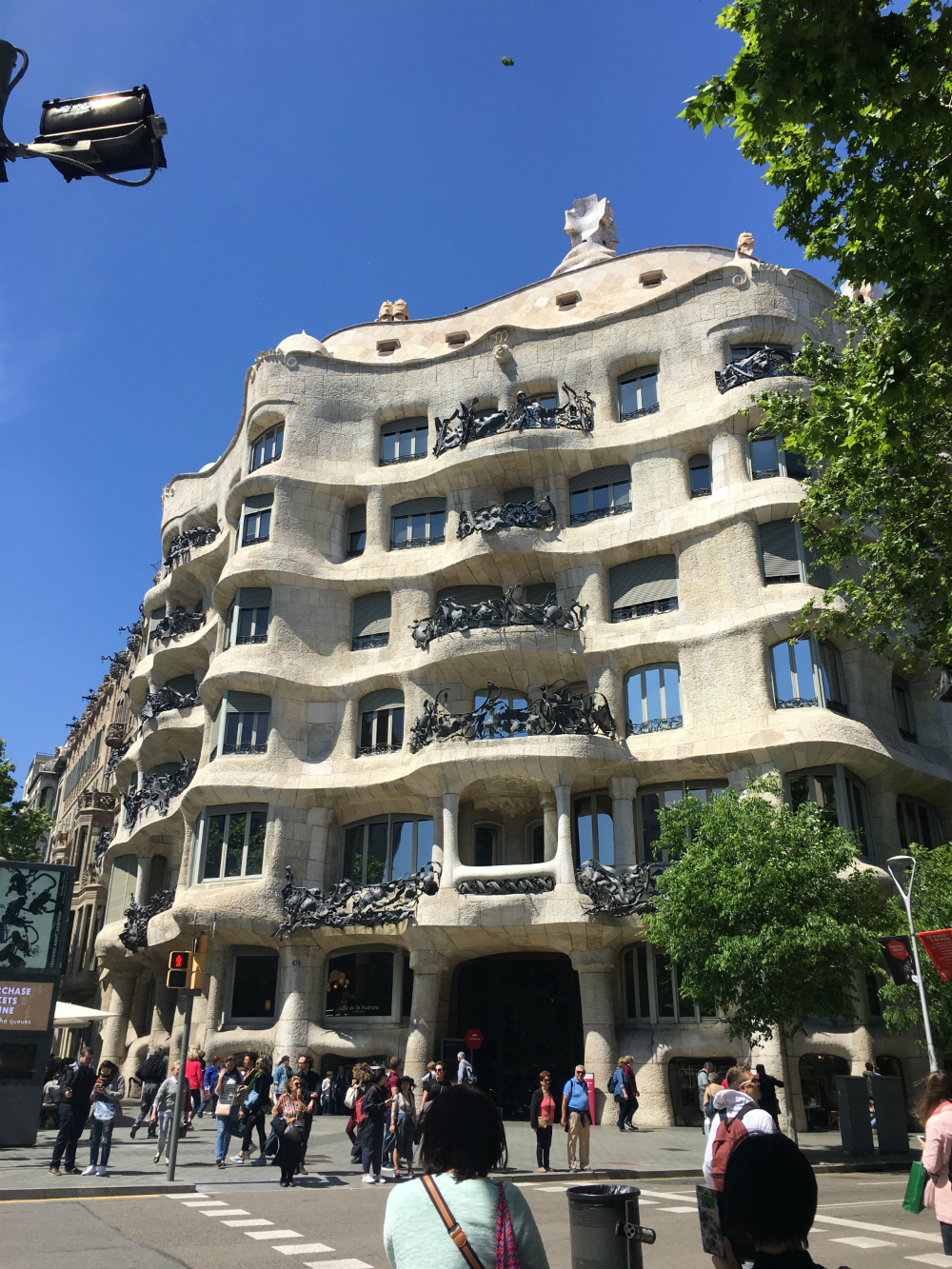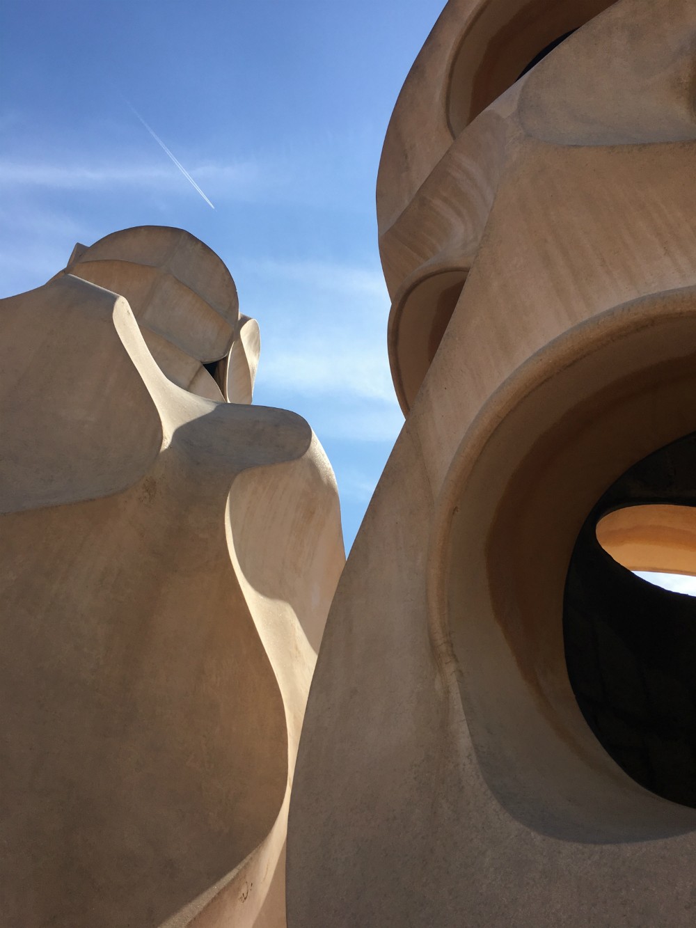 After our visit to La Sagrada Família, we walked into the stylish Eixample neighborhood to visit La Pedrera and Casa Batlló, both located on the busy Passeig de Gràcia. The road is a nice stroll, akin to walking down Fifth Avenue in New York City, past designer shop windows and beautiful apartment facades. We visited the interior of Le Pedrera, but were feeling a bit tired after all our walking in the hot sun, so we opted to skip the interior of Casa Batlló. My favorite part of Le Pedrera was the rooftop, which is dotted with tiled sculptures that look like giant rooks, and an undulating layout that reminds you of shifting sands.