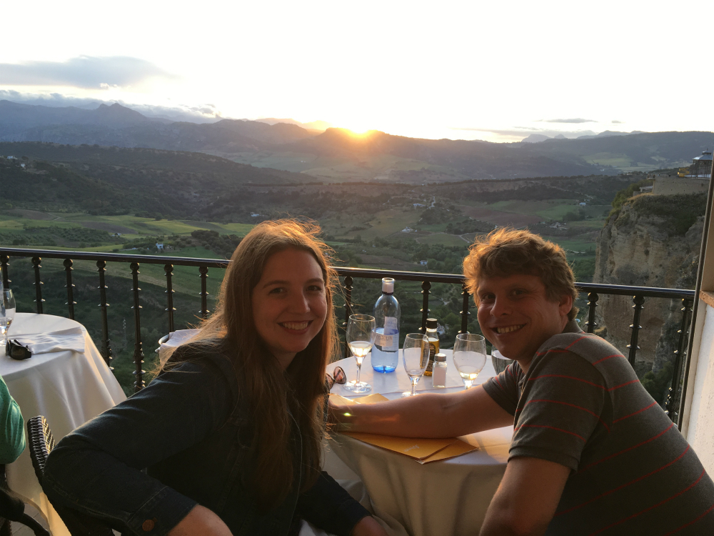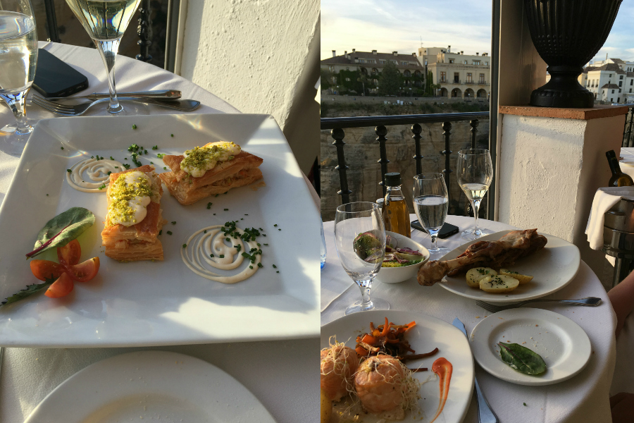 For our last dinner in Ronda, we made a reservation at the restaurant at our hotel, which is called the Albacara Restaurant, because it is seriously the best view in the city. Their terrace looks out over the cliff and all the surrounding country, and faces west so you can watch the sun set over the mountains. They only have about 8 tables on the terrace though, so a reservation is a must. The food was also superb. We shared an appetizer of crab in puff pastry, and then I had a salmon roulade for dinner while Andrew had a giant leg of lamb. If you are looking for a super romantic dinner, this is it. A must-do in Ronda!